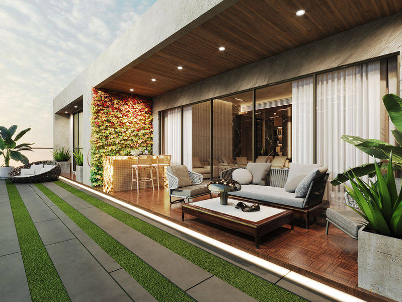 Against this backdrop of white, brown veneer, and marble, grey sofas emerge as sophisticated focal points, their understated elegance complementing the surrounding palette with effortless grace. The grey sofas offer inviting retreats, combining comfort with chic contemporary design. Subtle accents and curated decor elements add layers of visual interest, enhancing the room's aesthetic appeal and creating a cohesive and harmonious environment. Thoughtfully designed lighting solutions further elevate the ambiance, casting a soft glow that accentuates the interplay of textures and tones.